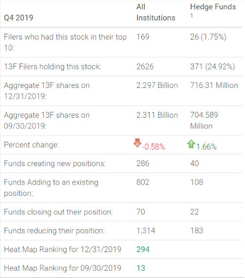 Exxon Mobil fell on the WhaleWisdom Heatmap to 294 from 13 in the previous quarter. Institutions overall were selling the stock, with the number of aggregate 13F shares decreasing by 0.58% as of December 31, 2019. Turning to hedge fund activity, 108 added to an existing position as 183 reduced their holdings.
