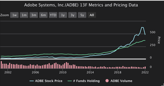 Adobe received mixed responses from Hedge Funds and Institutions in the fourth quarter. While Hedge Funds were selling, some Institutions added the stock to their portfolios, and the aggregate 13F shares held by institutions increased to approximately 389.0 million from 388.1 million, a change of about 0.2%. In contrast, Hedge Funds decreased their holdings by about 6.3% to 90.4 million from 96.5 million. Overall, 37 created new positions, 153 added to an existing holding, 46 exited, and 152 reduced their stakes. While Adobe’s stock price recently saw a dip, long-term 13F metrics between 2002 and 2022 suggest that Adobe has long-term investment potential.