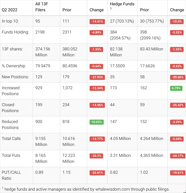 Hedge Funds adjusted their portfolios in the second quarter, and the aggregate 13F shares held decreased to approximately $82.1 million from $83.4 million, a reduction of about 1.6%. Overall, 35 hedge funds created new positions, 173 added to an existing one, 44 closed out exited, and 147 reduced their stakes. Institutions lowered their holdings by about 1.6% to $374.2 million.