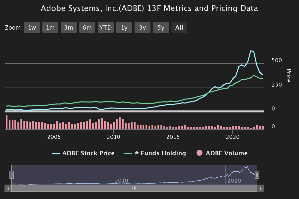 Adobe, Inc. (ADBE) continues to shadow the S&P 500 as it navigates a volatile market. The first nine months of 2022 have been challenging for many companies and investors. Adobe underperformed the S&P, seeing negative growth of approximately 51% as of September 29, 2022, while the S&P declined about 15% over the past year. Hedge funds were selling the stock in the second quarter, though the stock rose on the WhaleWisdom Heatmap to a rank of six from eighteen.