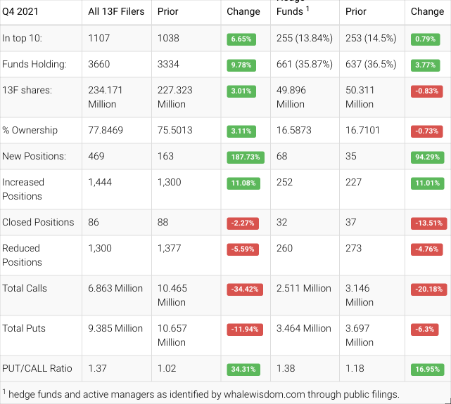 Hedge Funds adjusted their portfolios in the fourth quarter, and the aggregate 13F shares held decreased to approximately $49.9 million from $50.3 million, a slide of about 0.8%. Overall, 68 hedge funds created new positions, 252 added to an existing holding, 32 exited, and 260 reduced their stakes. In contrast, institutions increased their holdings by about 3.0% to $234.2 million from $227.3 million.