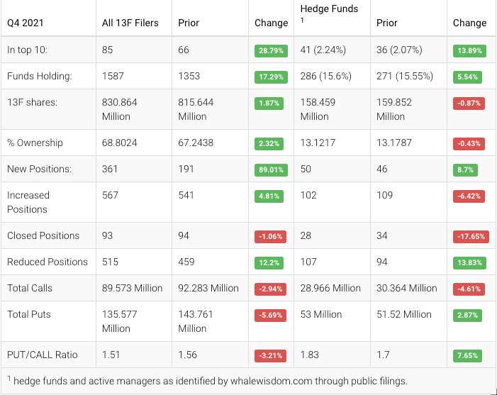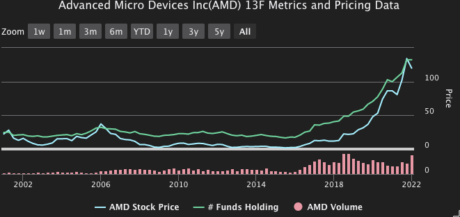 AMD saw hedge funds actively selling in the fourth quarter. The aggregate shares held by hedge funds decreased to about 158.5 million from 159.9 million, a change of approximately 0.9%. Of the hedge funds, 50 created new positions, 102 added to an existing holding, 28 exited, and 107 reduced their stakes. In contrast to hedge funds, institutions were buying and increased their aggregate holdings by about 1.9%, to approximately 830.9 million from 815.6 million. Also, long-term 13F metrics between 2002 and 2022 suggest that AMD continues to have investment potential.