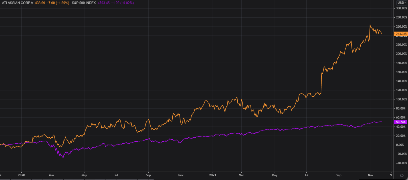 Atlassian’s shares are up, and analysts expect to see revenue continue to rise over the next two years for the software company, with increases in growth from 2022 to 2023 that could bring earnings to $1.60 by June 2022 and $2.06 by June 2023. This prediction for strong growth may also bring revenue to an estimated $2.6 billion in 2022 and approximately $3.2 billion in 2023. Atlassian also announced In October 2021 that the first quarter subscription revenue was up 57% and has raised expectations for continued revenue growth.