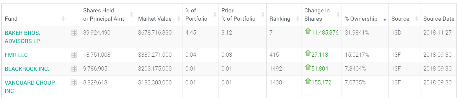 According to WhaleWisdom’s data, as of November 27, the Baker Brothers owned a total of 39.9 million shares or 32% of the company. That is up from 28.4 million shares or 22.8% of the company as of September 30. The second largest holder of the stock is Fidelity, with 18.7 million or 15% of the company. These two holders alone control more than 47% of the total shares, a massive stake between them.