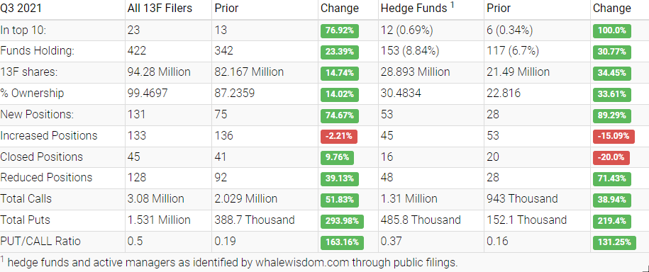 Bill saw positive third-quarter activity from both hedge funds and institutions. Hedge funds increased their aggregate 13F shares held to approximately 28.9 million from about 21.5 million. Of hedge funds, 53 created new positions, 45 added to an existing holding, 16 exited, and 48 reduced their stakes. Institutions increased their aggregate holdings to about 94.3 million from 82.2 million.