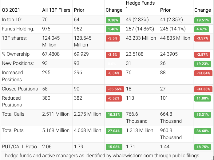 Hedge funds were selling in the third quarter of 2021, and the aggregate 13F shares held decreased approximately 3.6% to about 43.2 million from 44.8 million. Of the hedge funds, 31 created new positions, 76 added, 18 exited, and 113 reduced their stake. Institutions also sold and decreased their aggregate holdings by about 3.5% to approximately 124.1 million from 128.6 million.