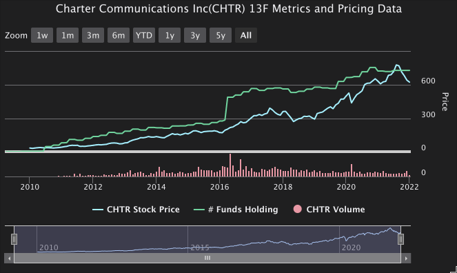 Analysts anticipate that earnings will rise through 2022, with an estimated $22.90 for December 2021 and $31.09 by December 2022. Revenue estimates also include healthy year-over-year growth that could bring revenue to approximately $54.4 billion by December 2022. The 13F metrics trend between 2010 and early 2022 shows that Charter has generally followed an upward trend.