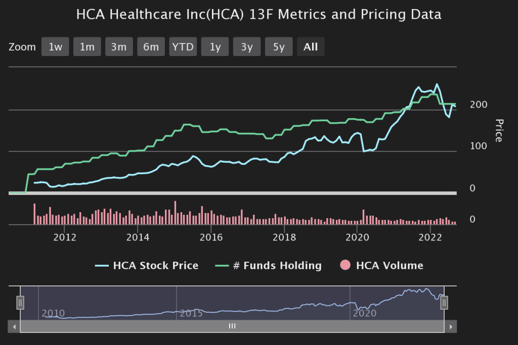 Analysts expect to see revenue rise through 2023 with year-over-year growth that could increase revenue to $63.4 billion by December 2023. Analysts are also optimistic about earnings and predict earnings per share of $17.26 by December 2022 and $19.05 by December 2023. The company’s 13F metrics show a span of upward mobility between 2012 and 2022, demonstrating HCA Healthcare’s investment potential.