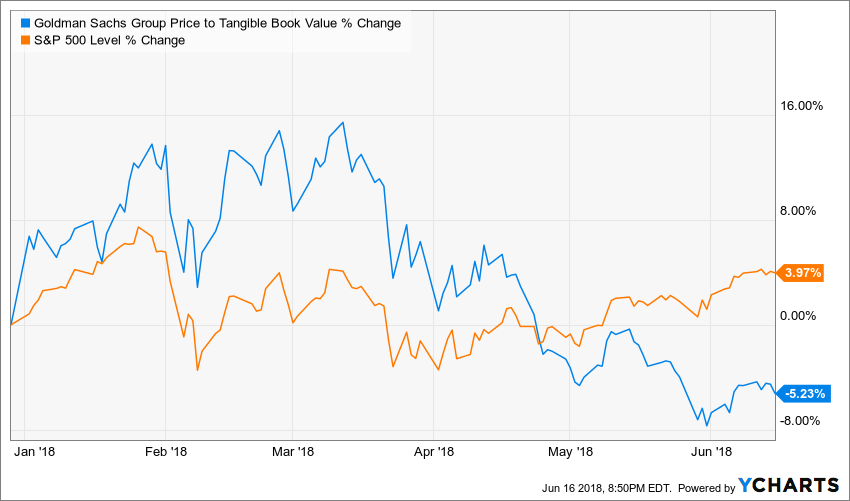 Even with the pullback, the stock is still at a lofty level on a price to tangible book value, at 1.3. In fact, the current valuation places Goldman at the upper end of its historical range over the past five years.