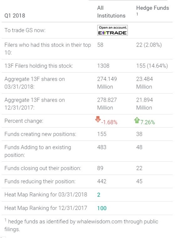 Hedge funds where aggressively adding to their positions in Goldman in the first-quarter. The total number of aggregate 13F shares held by hedge funds increased by over 7 percent to 23.5 million shares. In fact, Goldman’s stock was rated as the second hottest stock in the first-quarter on the Whale Wisdom heat map, just behind Worldpay, Inc. (WP).