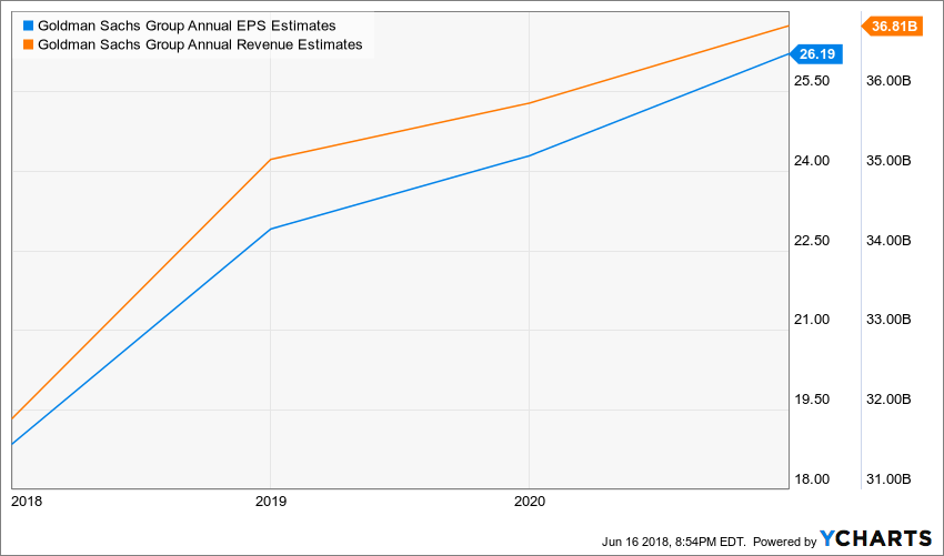 Another potential headwind facing Goldman, like many of the banks is decelerating growth. Earnings are forecast to grow by nearly 15.9 percent in 2018 and fall to only 6 percent in 2019. Meanwhile, revenue growth is seen slowing from 9.5 percent in 2018, to just 2 percent in 2019.