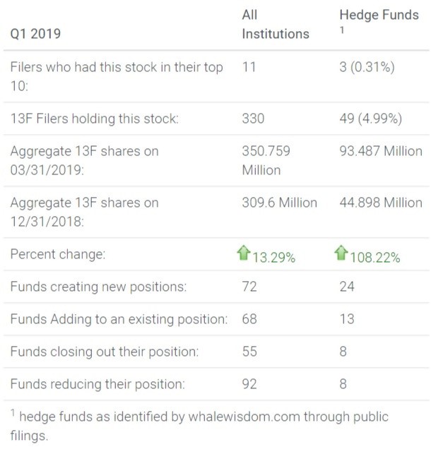 During the first quarter, the aggregate number of 13F shares held among hedge funds more than doubled, rising to 93.5 million from 44.9 million. Additionally, the number of total shares among institutions increased by over 13% to 350.7 million from 309.6 million. In total, 24 hedge funds created new positions in the stock, while 13 added to existing holdings. Meanwhile, 8 hedge funds reduced their stakes, while 8 exited the stock.