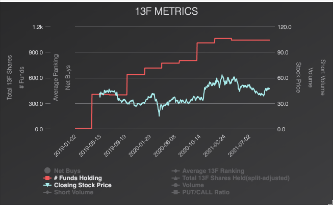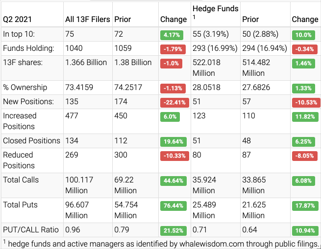 At the end of the second quarter, hedge funds were buying shares, and the aggregate 13F shared held increased to approximately 522.0 million from 514.5 million, an increase of about 1.5%. Overall, 51 hedge funds created new positions, 123 added to an existing one, 51 exited, and 80 reduced their stakes. In contrast, Institutions decreased their aggregate holdings by about 1.0% to 1.37 billion from 1.38 billion.