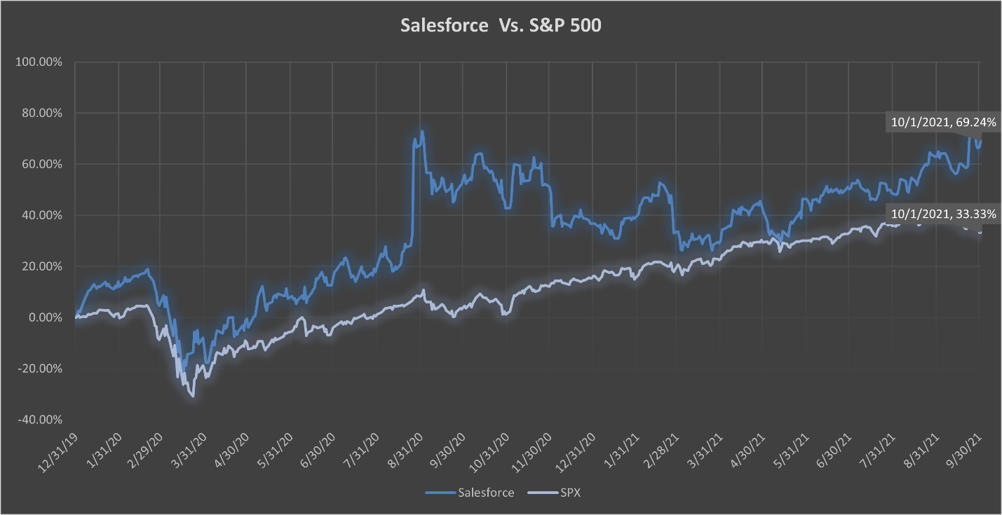 Salesforce is a cloud-based software company and global specialist in customer relationship management (CRM). It provides CRM services and a suite of applications that focus on customer service, marketing automation, analytics, and application development. Salesforce’s business model has become more attractive during the coronavirus pandemic by allowing customers to use their cloud technology for improved communication and information-sharing during a time of increased telework and remote collaboration. In addition to Salesforce’s 2021 acquisition of Slack Technologies, Inc. that complemented its communication services, Salesforce also recently held its annual Dreamforce conference. The conference focused on helping companies find solutions to problems related to the pandemic and highlighted the importance of digital headquarters.