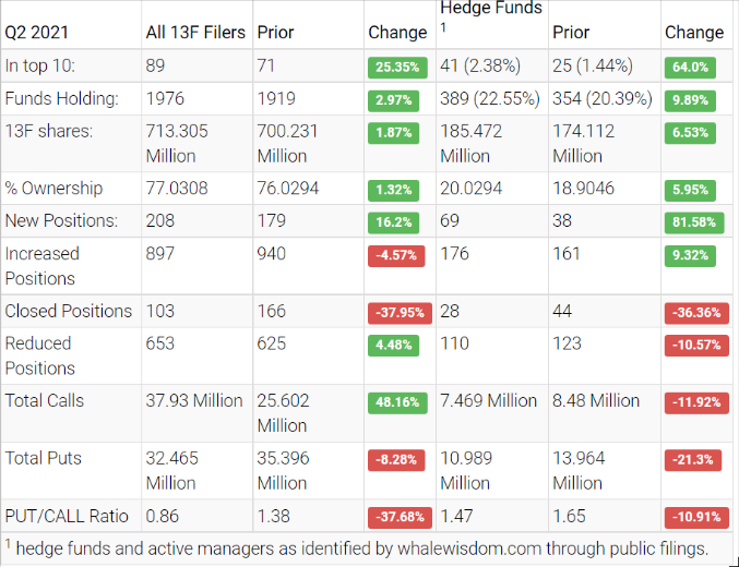 Hedge funds and institutions were increasing shares in their portfolios. The aggregate 13F shares held by hedge funds increased to about 185.5 million from 174.1 million. Of the hedge funds, 69 created new positions, 176 added to an existing one, 28 exited, and 110 reduced their stakes. Overall, institutions increased their aggregate holdings by about 1.9% to approximately 713.3 million from 700.2 million.