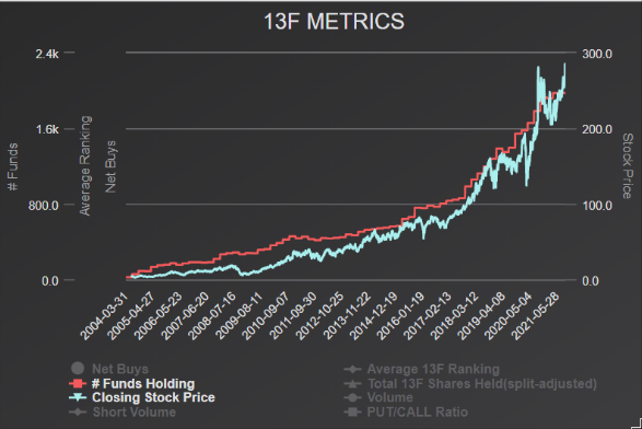 Salesforce.com Inc. (CRM) continued its upward momentum, outperforming the S&P 500 and rising by approximately 69.2% compared to the S&P’s gain of about 33.3% since the start of 2020. The cloud services company saw positive second-quarter results, and long-term 13F metrics between 2004 and 2021 suggest that Salesforce’s investment potential remains strong.
