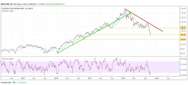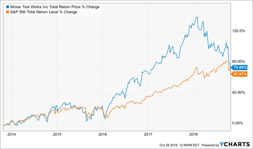 Illinois Tool Works, Inc’s (ITW) stock has increased by 58% over the past five years beating out the S&P 500’s rise of 51%. Including dividends, Illinois Tool Works has been able to climb by 76% compared to the S&P 500 Total Return Index rise of 68%. However, the shares have fallen on hard times recently, dropping by 30% from their January 2018 highs.