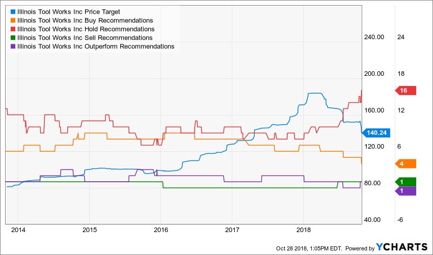 Since the company’s disappointing results some analysts have downgraded the stock and lowered their price targets. For example, Wells Fargo reduced their price target to $145 from $150, noting that revenue for the company was even weaker than expected. Additionally, Seaport Global downgraded the stock to a neutral from a buy and cut its price target to $132 from $170. The firm noted that Illinois Tool was hurt by pockets of slowing international end markets and slower international auto production.