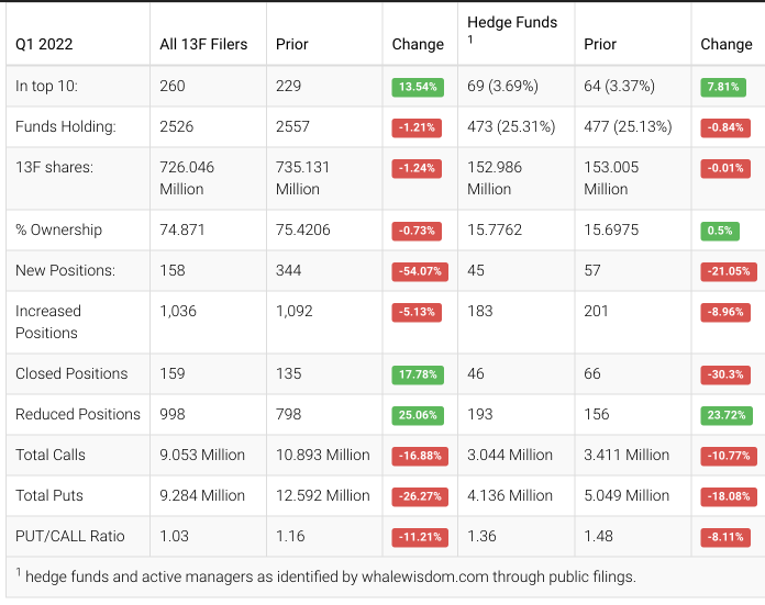 Hedge funds were selling the stock in the first quarter of 2022, with the aggregate 13F shares held lowered to approximately 152.99 million from 153.01 million, a change of roughly 0.01%. Of the hedge funds, 45 created new positions, 183 added, 46 exited, and 193 reduced their stakes. Institutions sold and decreased their aggregate holdings by about 1.2% to approximately 726.1 million from 735.1 million.