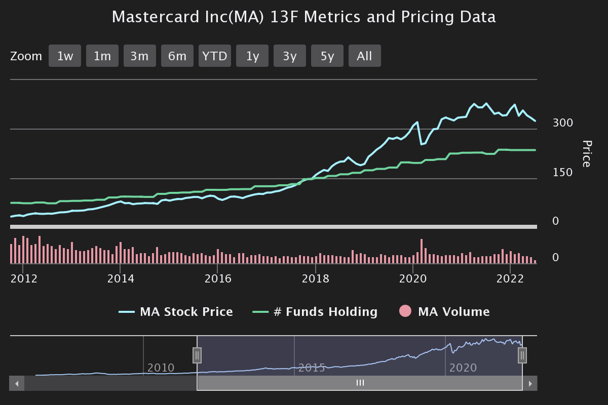 Analysts expect to see earnings increase in 2022 and 2023, bringing earnings per share to $12.65 by December 2023, up from an estimated $10.52 for December 2022. Revenue estimates are also encouraging, with an anticipated rise to approximately $22.2 billion by December 2022 and an estimated revenue of about $25.9 billion by December 2023. The 13F metrics between 2012 and 2022 show that funds held remained reasonably steady, despite MasterCard’s more recent fluctuating stock price.