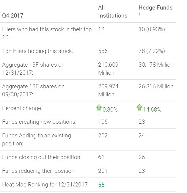 During the fourth quarter, 47 institutions created or added to positions in the stock, while 49 institutions reduced or closed out their positions. However, the aggregate number of shares held in the stock increased by nearly 15 percent to 30.18 million shares, up from 26.31 million in the third quarter.