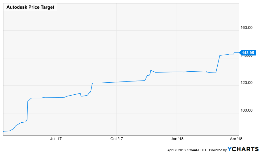Analysts are bullish on the stock as well with the forecast calling for earnings growth of over 250 percent in fiscal 2020 to $3.19 per share, from $0.90, while revenue is expected to climb over 27 percent, to $3.179 billion from $2.496 billion. Analysts are looking for Autodesk’s bull run to continue in 2018, with an average price target of nearly $144 per share, 15 percent higher than its current stock price of $125.75. Nearly 78 percent of the 23 analysts that follow the stock have a “buy” or “outperform” rating on the stock, while roughly 22 percent have “hold” or “sell” recombination, according to Ycharts.