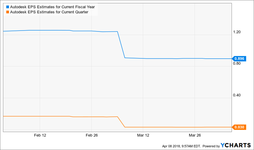 It is not all rosy for Autodesk because those same analysts have also been trimming their outlook of the monstrous earnings growth rate. Over the past 30 days, analysts have been slashing their full-year earnings outlook for fiscal 2019 by nearly 28 percent and trimming revenue estimates by 2 percent. The outlook for first quarter 2019 has also declined, with earnings estimates dropping nearly 82 percent over the past 30 days to $0.03, while revenue has been cut by nearly 4 percent to $562 million when the company next reports results in the middle of May.