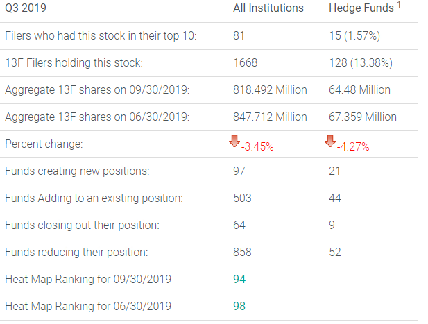 During the third quarter, the total number of 13F shares held by institutions fell by almost 4% to 818.5 million from approximately 847.7 million in the second quarter. During the quarter, 503 institutions added to their existing positions, while 97 created new ones. Conversely, the number of firms decreasing their positions was at 858, while 64 sold out of the stock. Also, the number of firms holding Starbucks among their top ten holdings in their portfolio fell to 81 in the third quarter, down from 89 in the second quarter.