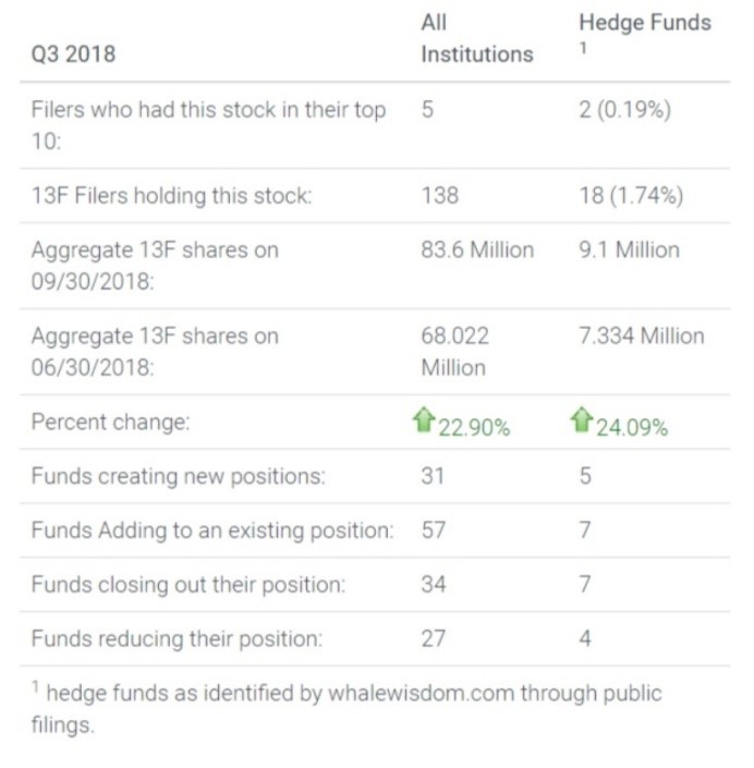 In total, hedge funds increased their total 13F holdings in the quarter by 24% to 9.1 million shares. Additionally, all institutions increased their total holdings by 23% to 83.6 million shares. In total, 31 institutions created new positions in the stock, while 57 added to existing ones. On the other hand, 34 institutions exited, while 27 reduced their stakes.