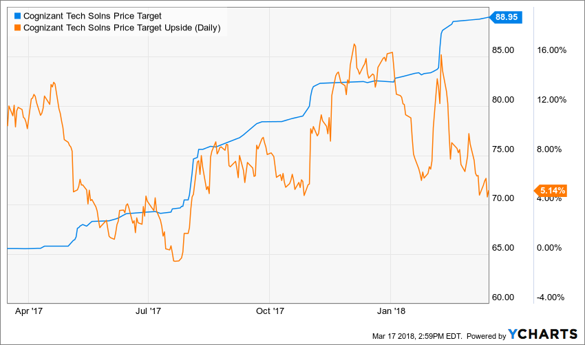 The bullish investor optimism comes despite a muted outlook from sell-side analyst, which see the stock rising to only $88.75 on average according to data from Ycharts. It could be an indication there is not much more room for shares of Cognizant to increase, or that analysts are underestimating Cognizant’s business and will need to up those estimates and targets.