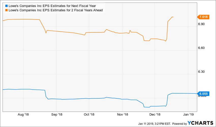 Analysts are not looking for much of a slowdown from the company as it starts fiscal-year 2020. Estimates are for Lowe’s to grow its earnings 18.4% in fiscal 2020 to $6.05 per share, on revenue growth of 1.7% to $72.6 billion. Those earnings estimates have fallen about 1% since July, while revenue estimates have dropped about 2.7%, certainly not severe.