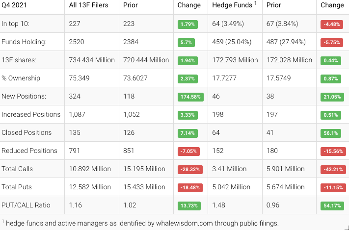 Mastercard saw favorable results in the fourth quarter and the aggregate 13F shares held by hedge funds increased to about 172.8 million from 172.0 million, a mild increase of approximately 0.4%. Of the hedge funds, 46 created new positions, 198 added to an existing one, 64 exited, and 152 reduced their stakes. Institutions were also buying. Overall, institutions increased their aggregate holdings by about 1.9%, to approximately 734.4 million from 720.4 million.