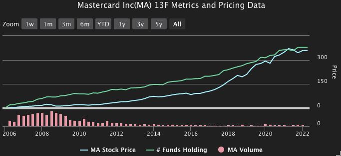 Analysts expect to see earnings rise in 2022 and 2023, bringing earnings per share up to $10.25 by December 2022 and $12.69 by December 2023. Sales estimates are also favorable, with an anticipated rise by late 2023 to approximately $26.1 billion, up from $22.3 billion in December 2022. Mastercard’s 13F metrics between 2006 and 2022 show an encouraging upward trend.