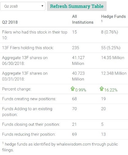 During the second quarter, hedge funds were adding to their holdings in the stock, increasing the number of total 13F shares 16% to 14.35 million shares. 19 hedge funds created new positions, while 20 funds added to existing ones. Meanwhile, only five holders exited, while 13 reduced their stakes. The number of total institutions owning the stock increased 1%.