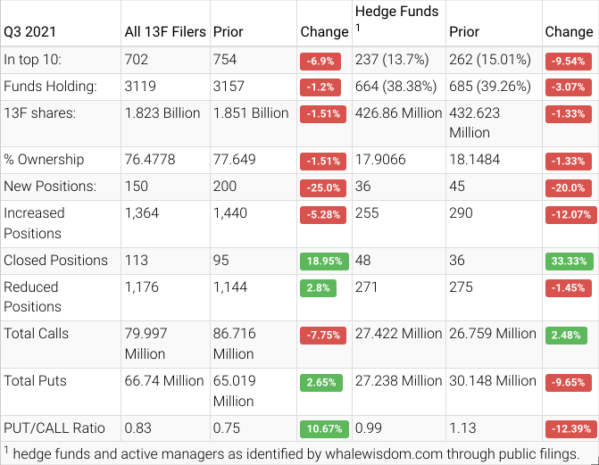 Hedge Funds adjusted their portfolios, and the aggregate 13F shares held decreased to approximately $426.9 million from $432.6 million, a slide of about 1.3%. Overall, 36 hedge funds created new positions, 255 added to an existing holding, 48 exited, and 271 reduced their stakes. Institutions also sold and lowered their holdings by about 1.5% to $1.82 billion from 1.85 billion.