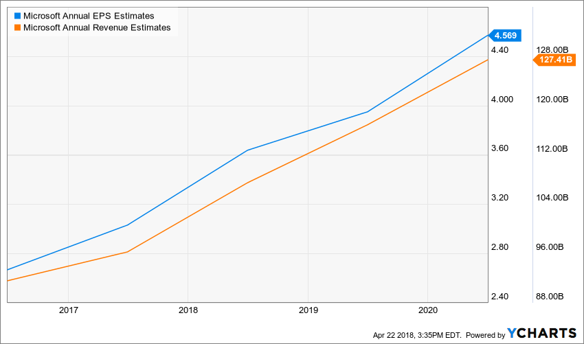 Analysts are looking for Microsoft to see earnings growth of nearly 16.5 percent to $0.85 per share, while revenue is expected to climb by nearly 9.5 percent to $25.78 billion, when the company reports fiscal third-quarter results on April 27. Microsoft is expected to see its full-year revenue growth of nearly 20 percent in 2018 to $107.45 billion, while earnings are expected to climb by only 10 percent to $3.64 per share. The big jump in forecasted revenue and slower growing earnings suggest that analysts are expecting higher cost in 2018, because earnings growth is expected to stay around 8.5 percent in 2019 as well, and that might make the stock rich at current levels.