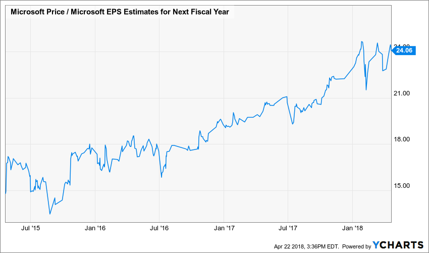 Microsoft current valuation makes it one the more expensive technology stocks. The Technology Select Sector SPDR (XLK) Top 25 holdings have an average one-year forward PE ratio of 20.9, versus Microsoft’s 24 times 2019 earnings estimates. Not only that, Microsoft currently has its highest earnings multiple in nearly three years.