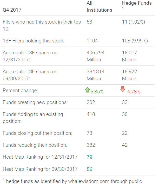 Shares of the chipmaker are off to a hot start in 2018, with the stock climbing by 23 percent, easily beating the S&P 500’s loss by nearly 24 percentage points. The stock was put into the WhaleWisdom WhaleIndex during February of 2017; shares have soared by about 120 percent since the addition.