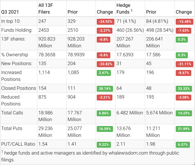 The aggregate 13F shares held by hedge funds increased to approximately 207.3 million from 206.6 million, a positive change of about 0.3%. Overall, 31 hedge funds created new positions, 179 added to existing holdings, 64 exited, and 189 reduced their stakes. Despite, hedge funds adding to positions, institutions were selling and lowered their holdings by about 0.8% to 78.4 million from 79.0 million.
