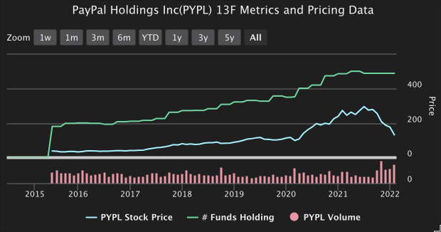 Analysts expect to see earnings rise to $4.67 per share by December 2022 and $5.87 by December 2023. Revenue estimates offer encouragement, with predictions of approximately $29.4 billion for December 2022 and about $35.3 billion by December 2023. The 13F metrics between 2015 and 2022 reflect PayPal’s recently fluctuating stock price, while the trend for portfolio holdings demonstrated steady improvement before leveling off and declining in recent months.