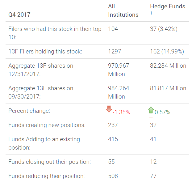 During the fourth quarter, 237 new institutions started new positions, while 415 added to existing positions. However, only 55 institutions closed out their position entirely, 508 institutions reduced their holdings. In fact, the total number of aggregate 13F shares on December 31, fell by 1.35 percent to 970.97 million shares from 984.26 million at the end of the third quarter.
