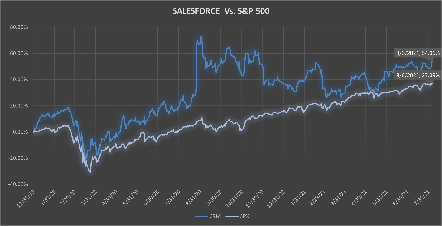 Salesforce.com, Inc. (CRM) has faced a rocky yet upward climb since the coronavirus pandemic first began impacting American businesses in March 2020. However, over the past year and a half, Salesforce realized continued growth, moving up on the WhaleWisdom Heatmap to a ranking of twenty-three. Salesforce outperformed the S&P 500, rising by approximately 54.1% as of August 6, 2021, compared to the S&P’s gain of about 37.1% since the beginning of 2020.
