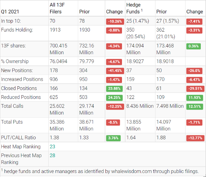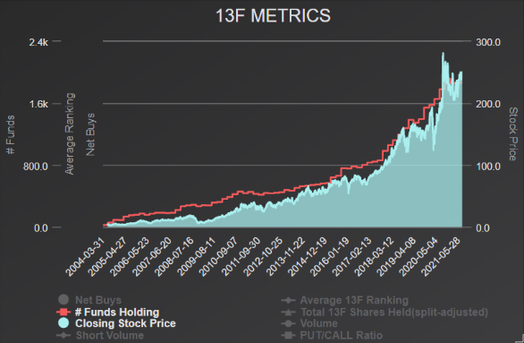 Salesforce saw underwhelming first-quarter activity, as institutions sold shares and hedge funds made minimal overall increases to portfolios. Looking at the top hedge funds, the aggregate 13F shares increased to about 174.1 million from 173.5 million, an increase of approximately 0.4%. Of the hedge funds, 37 created new positions, 159 added to an existing stake, 43 closed out their holdings, and 122 reduced their holdings. In contrast to hedge funds, institutions sold shares and decreased their aggregate holdings by about 4.3% to approximately 700.4 million from 732.2 million. However, longer-term 13F metrics show a positive trend of investors moving into the equity.