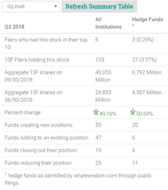 During the quarter, institutional investors increased their holdings in the stock by nearly 50%, with the total aggregate 13F shares rising to over 40 million shares from 26.9 million shares in the prior quarter. Of those institution buying the stock, 50 of them created new positions, while 47 added to existing ones. Only 19 institutions exited, while 25 reduced their holdings.