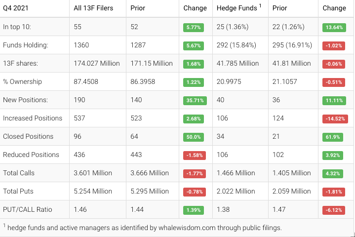 ServiceNow’s saw hedge funds selling in the fourth quarter, with the aggregate 13F shares held by hedge funds lowered to about 41.79 million from 41.81 million, a change of approximately 0.1%. Of the hedge funds, 40 created new positions, 106 added, 34 exited, and 106 reduced their holdings. In contrast to hedge funds, institutions were buying and increased their aggregate holdings by about 1.7% to approximately 174.0 million from 171.2 million.