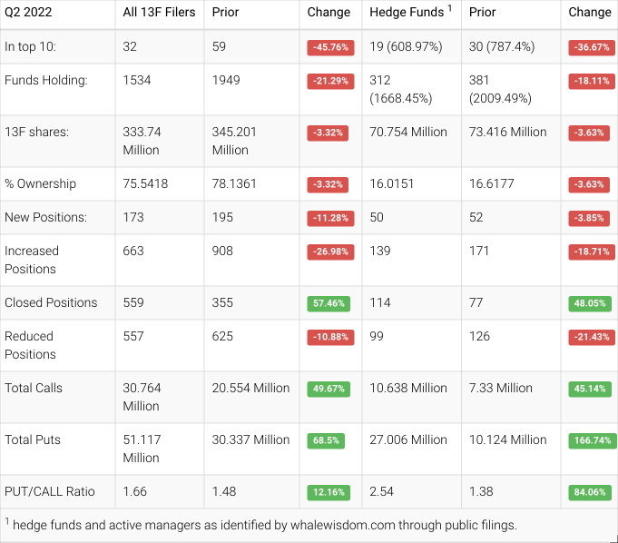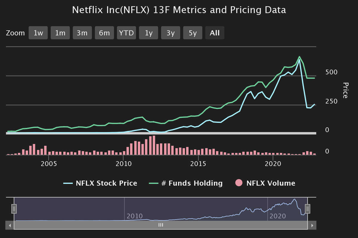 Hedge Funds adjusted their portfolios in the second quarter, and the aggregate 13F shares held decreased to approximately 70.8 million from 73.4 million, a slide of about 3.6%. Overall, 50 hedge funds created new positions, 139 added, 114 exited, and 99 reduced their holdings. Institutions also sold and lowered their holdings by about 3.3% to $333.7 million. The 13F metrics between 2005 and 2022 suggest that Netflix still has long-term investment potential.