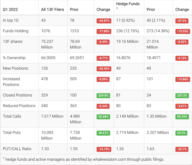 Shopify saw hedge funds selling in the first quarter of 2022, with the aggregate 13F shares held by hedge funds lowered to approximately 19.2 million from 21.0 million, a change of roughly 8.8%. Of the hedge funds, 49 were created, 87 were added, 81 closed, and 80 reduced their positions. Institutions sold and decreased their aggregate holdings by about 4.4% to approximately 75.2 million from 78.7 million.