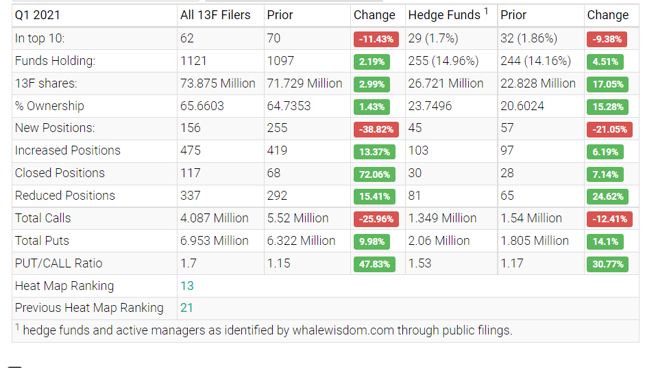 Hedge funds have been bullish on the stock, and institutions are also buying. The aggregate 13F shares held by hedge funds increased to about 26.7 million from 22.8 million in the first quarter, a change of approximately 17.1%. Of the hedge funds, 45 created new positions, 103 added to an existing holding, 30 exited, and 81 reduced their stakes. Overall, institutions were buying and increased their aggregate holdings by about 3.0% to approximately 73.9 million from 71.7 million.