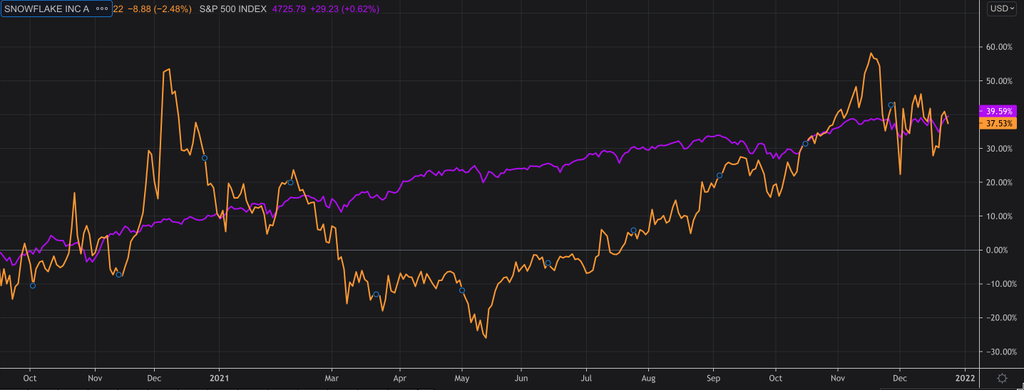 Snowflake is a technology company that provides a cloud-based data software platform to consumers worldwide to enable consumers to store, consolidate, and analyze information. Snowflake was known initially as Snowflake Computing, Inc. before being renamed to Snowflake, Inc. in 2019. Snowflake offers customers a flexible usage-based model to buy only what they need, allowing Snowflake to grow its revenue as its customers require more capacity. Overall, the technology sector saw a decline in early 2021, and Snowflake was caught in those winds of volatility. However, Snowflake ultimately began to rebound and navigate a steady upward climb.