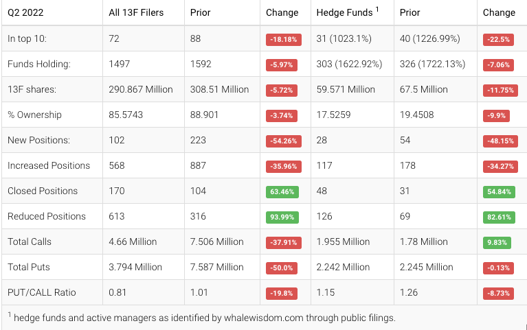 Hedge Funds adjusted their portfolios in the second quarter, and the aggregate 13F shares held decreased to approximately $59.6 million from $67.5 million, a slide of about 11.8%. Overall, 28 hedge funds created new positions, 117 added, 48 exited, and 126 reduced their holdings. Institutions also sold and lowered their holdings by about 5.7% to $290.9 million.